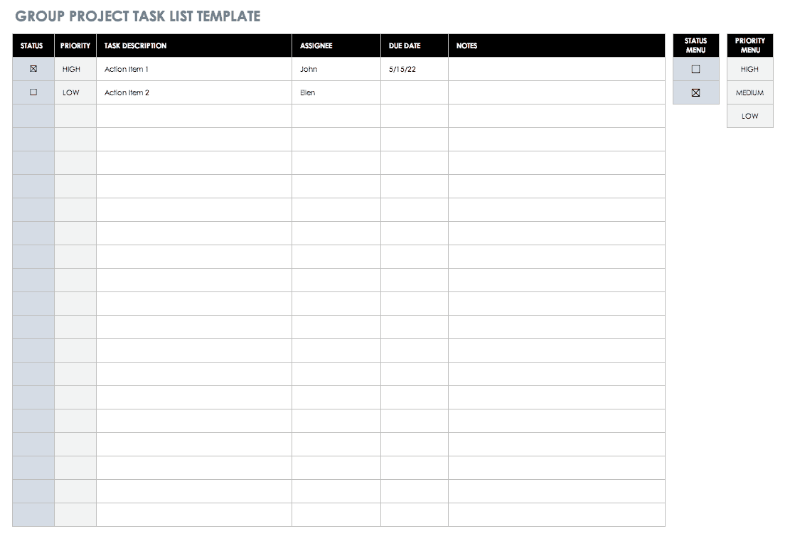 这个模板非常适合组织团队项目或涉及多人的任何任务的基本内容。只需在提供的列中列出每个任务、描述、受让人、截止日期和任何注释,并在需要时添加更多列。该模板不具有项目管理功能,但将为您提供每个单独任务的概述以及谁负责该任务。有关更多全面的项目管理模板,请阅读“顶级项目管理Excel模板”。