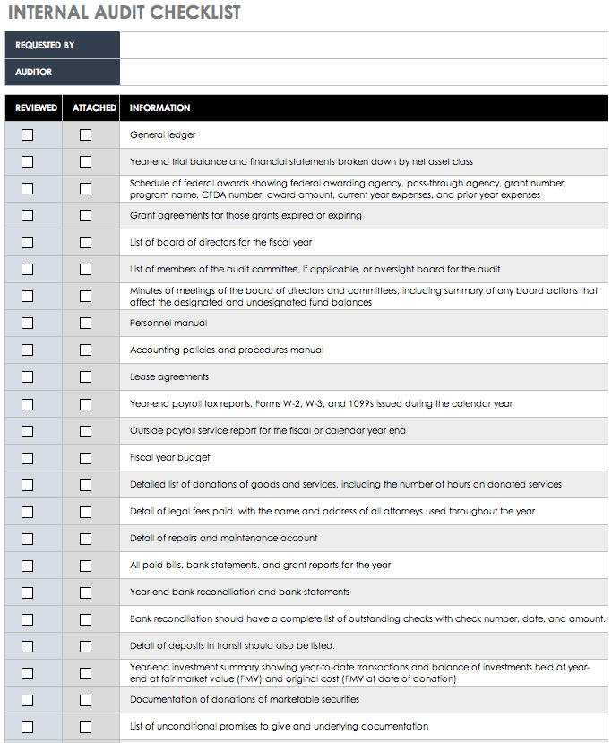 使用此模板准备财务审计。这个简单的模板包含标准审计(总账、余额和财务报表、税务报告等)中每个必需文件的行,以及一个复选框,用于说明某项是否已审查并已附加。添加或减去行,以包含审计所需的每个文档。要了解更多关于如何为财务审计做好最好的准备,请阅读这篇文章文章.