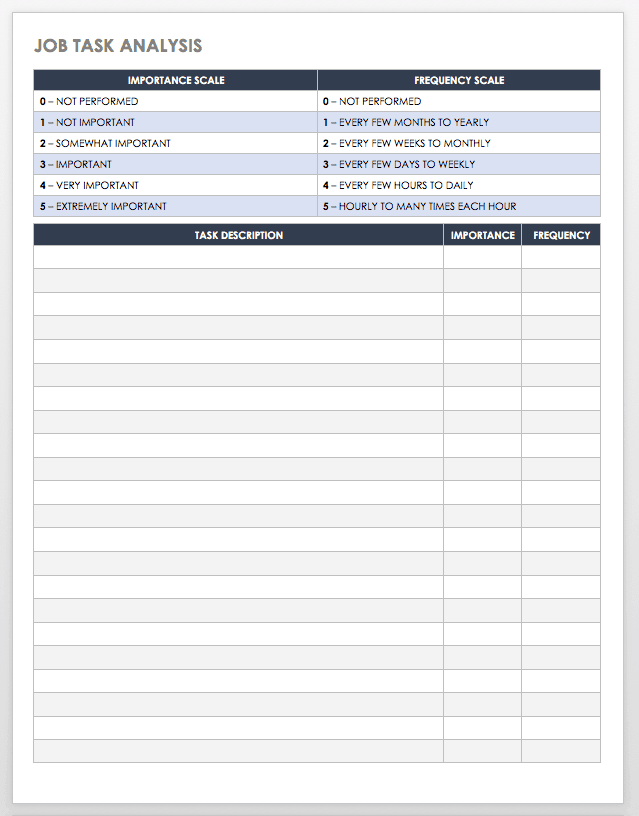 作业任务分析可用于确定哪些操作对某个作业是关键的。以这种方式确定任务可以帮助确定工作范围,评估员工表现,告知培训方法,并改进工作流程。在这个模板上,您可以列出完成一个作业所需的任务,然后对每个任务的重要性进行评级,以及操作执行的频率。您还可以为每个任务记录您的信息源。