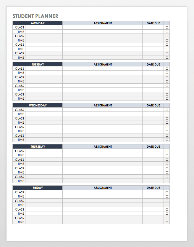 学生可以通过使用这个免费模板来计划这一周的课程和作业。该模板包括列出每个作业的截止日期和状态的列,这有助于学生保持组织,优先考虑他们的工作量,并在较小的压力下完成截止日期。