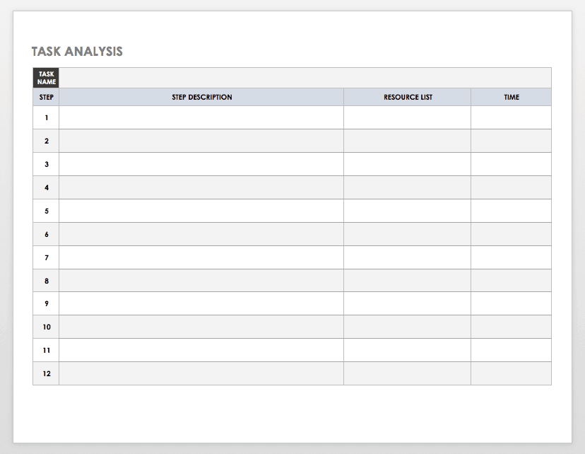 使用此任务分析模板来确定成功完成给定任务所需的资源和时间。欧宝体育app官方888模板包括描述任务中涉及的步骤、每个步骤所需的资源(人力、机械或金钱)以及花费在每个项目上的时间的部分。欧宝体育app官方888这提供了任务的详细分析,对于培训目的或需要评估过程的任何情况都很有用。