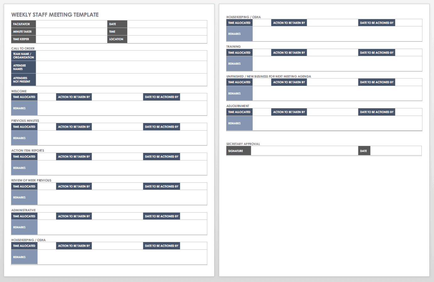 使用这个模板来准备一个经常性的会议。注意你的议程、与会者、行动项目,以及相关的任务是否已经完成。该模板在设计时考虑到了每周的会议,但您可以编辑每月、季度或年度会议的日期。
