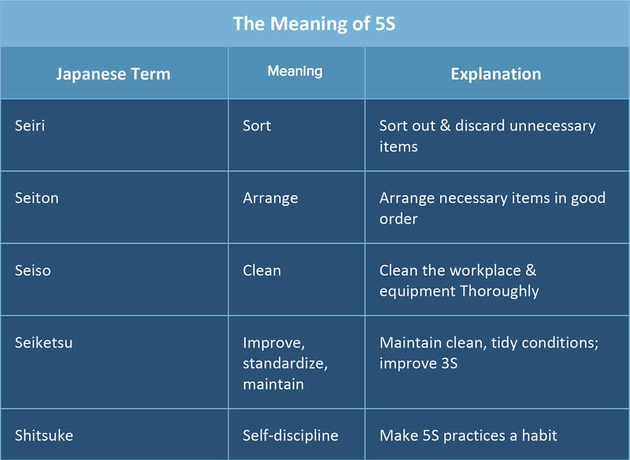 你可以开始通过诸如5S的实践来推广精益文化。在日语中,S代表Seiri, Seiton, Seiso, Seiketsu和Shitsuke。在英语中,S大致翻译为: