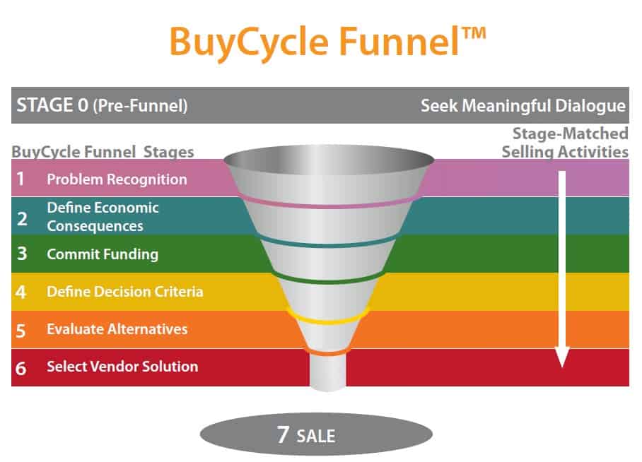 In Sellers’ BuyCycle Funnel™ design, the sales funnel and the sales pipeline are aligned. Together, the funnel and the pipeline consist of eight stages. "Thesales funnelandsales pipelineare inextricably linked in this concept, so that they are the same thing,” he explains.