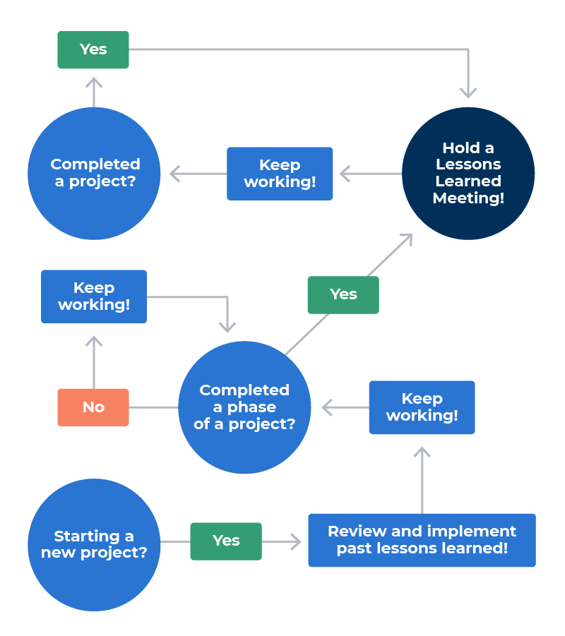 You can hold a lessons learned meeting at the beginning of a new venture to review lessons learned from past projects and brainstorm ways to apply them in the present. You should also have meetings at regular intervals throughout your project lifecycle, or as your team finishes predetermined tasks.