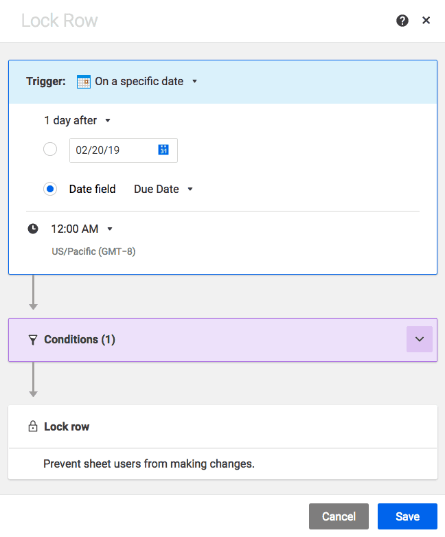选择计划的客户还可以根据特定的工作表更改或特定的日期和时间自动锁定或解锁行。通过这种方式,您可以管理阶段门进程、将锁定行与关键最后期限对齐等等。