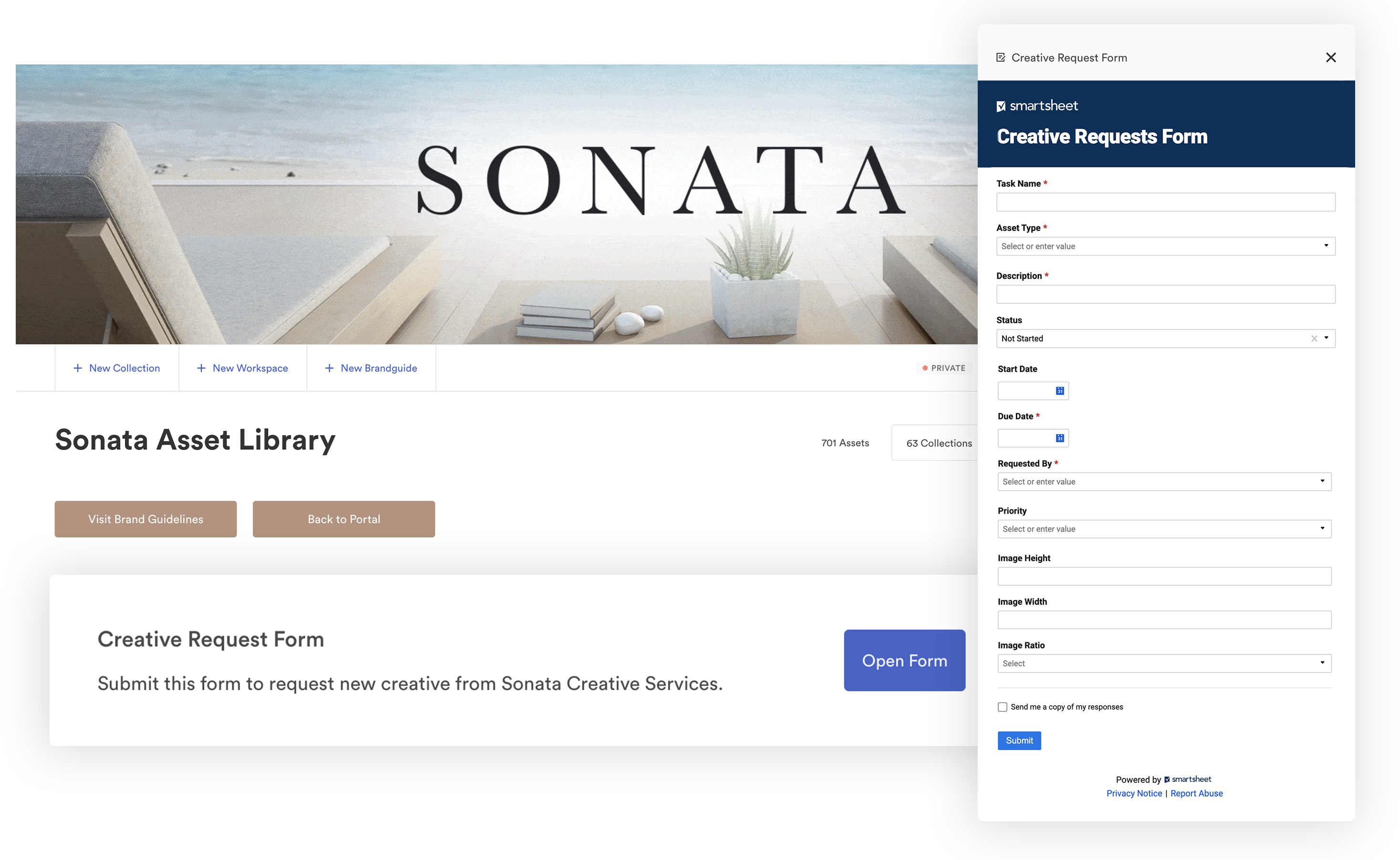 - 在品牌文件夹中嵌入Smartsheet请求表单在Brandfolder和Collection级别简化内容生产,并在Smartsheet中触发自动化工作流。ob欧宝娱乐app手机下载您还可以处理Brandfolder中不存在的文件的资产请求。