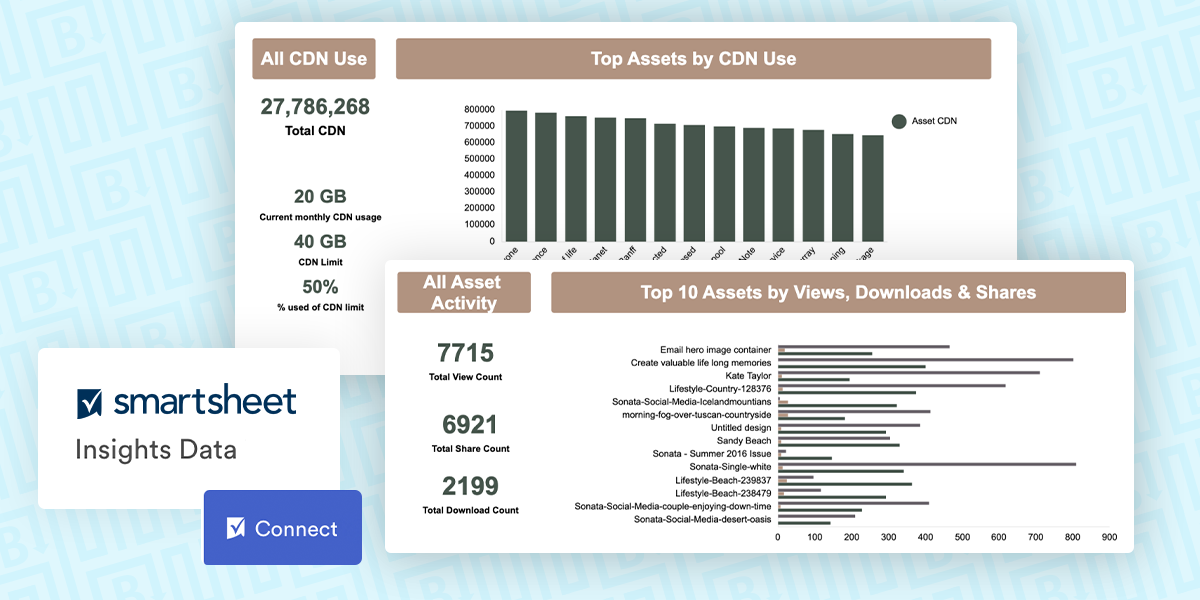 - 同步从Brandfolder到Smartsheet的见解创建自定义报告和仪表板,从两个平台提取数据,帮助团队和高管将资产和团队绩效联系起来,形成创意和营销策略。