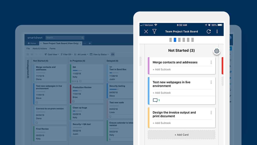 今天,我们很自豪地宣布,卡片视图可在Smartsheet移动应用程序(iOS而且安卓),帮助您可视化,访问和行动的工作,在任何地方,只需几次轻敲。