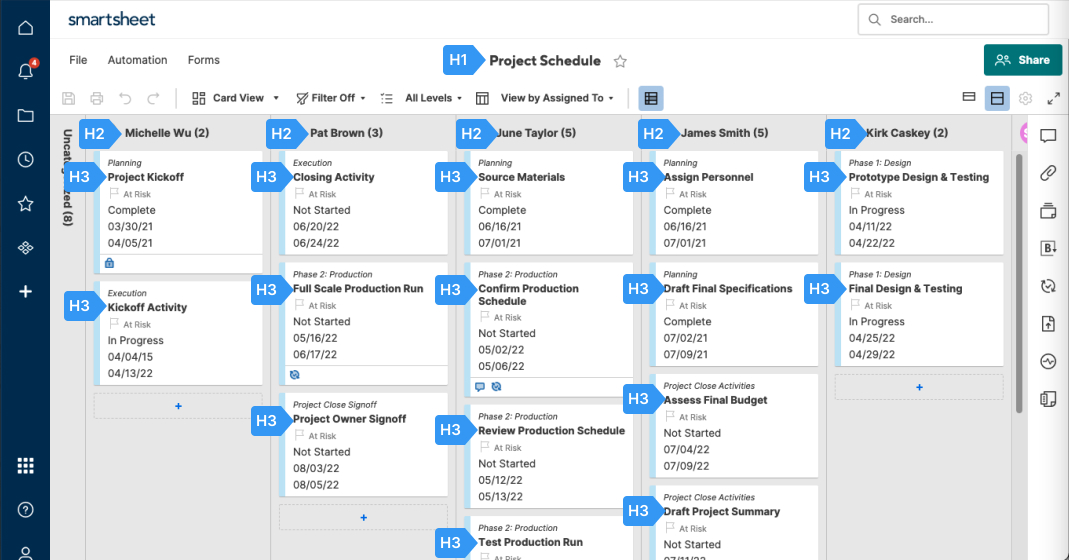 Smartsheet屏幕的图像,显示为导航实现适当语义标题的计划。