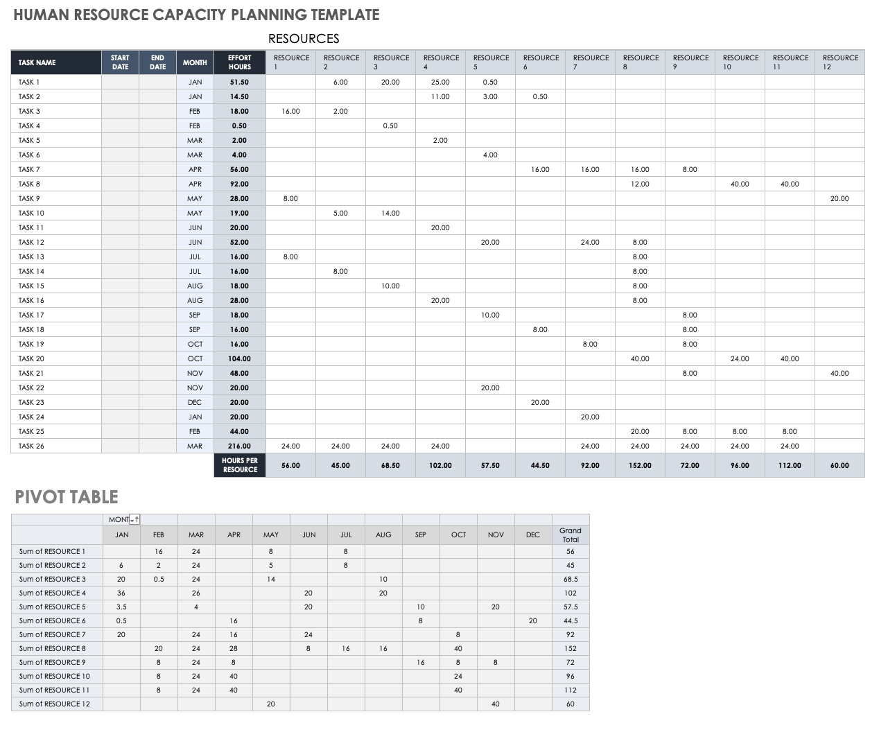 此人力资源能力规划模板欧宝体育app官方888提供了一个团队或组织将需要的人力资源的概述,以确保项目的及时交付。输入一个资源一个资源和一个任务一个任务的需求来计算一个项目或投资组合的总工作时间。该模板还提供了一个透视表,您可以使用它快速查看基于活动和挂起的每月项目活动的更改,每个资源分配给每个任务的工作时间。