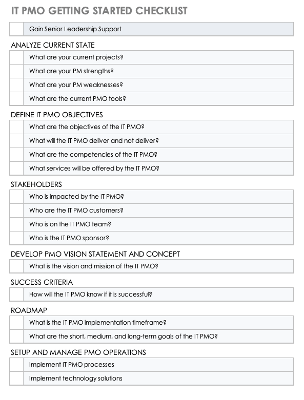 If you’re struggling to get your IT PMO started, this free IT PMO checklist will help. The checklist guides you through a series of questions and action items that will lead you from analyzing your current state to measuring success.
