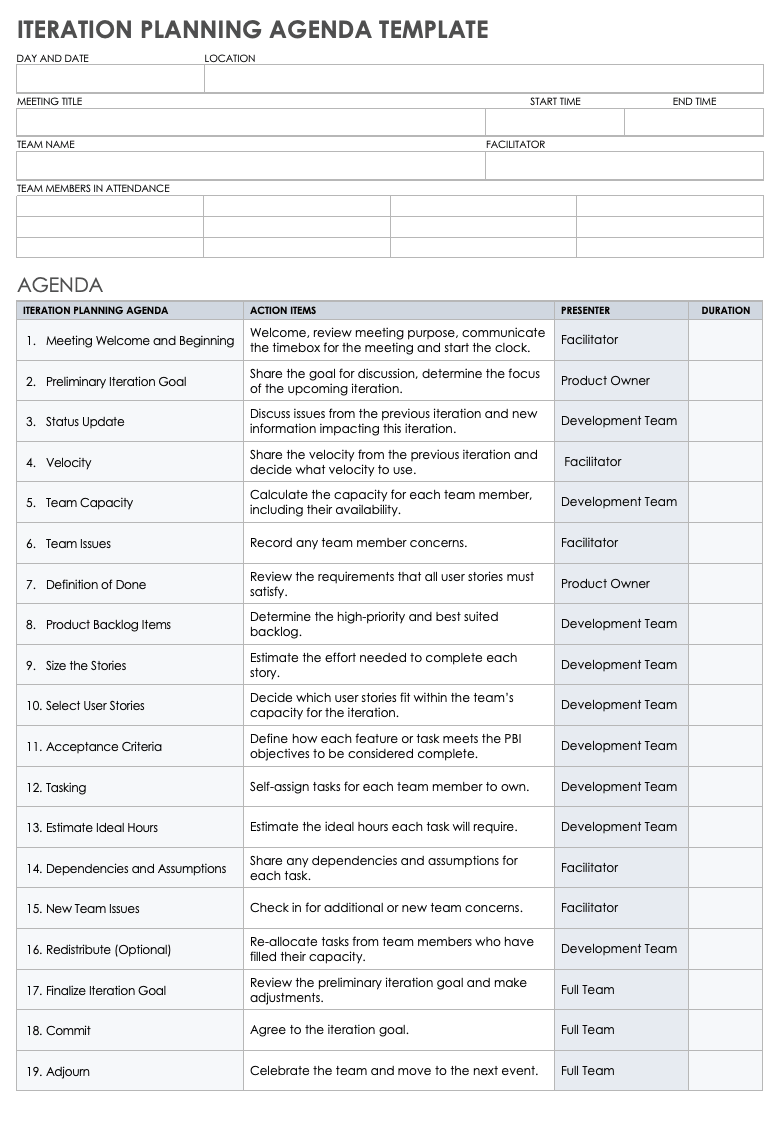 - 时间段:会议的时间限制。当计划一个两周的迭代时,时间限制不应该超过四个小时。