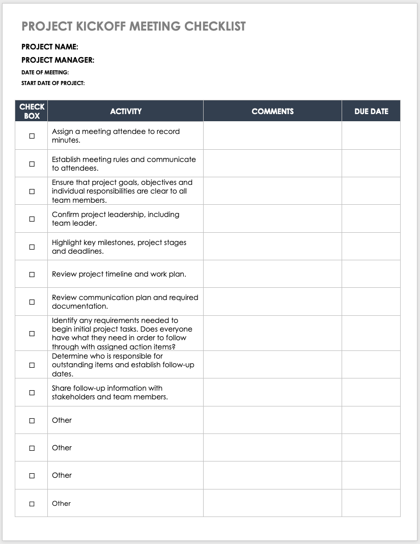 一个项目启动模板帮助确保您涵盖了人们有效工作所需的所有信息,并理解了构成项目成功的要素。启动模板可以是准备清单、会议议程大纲、演示模板或电子邮件公告。