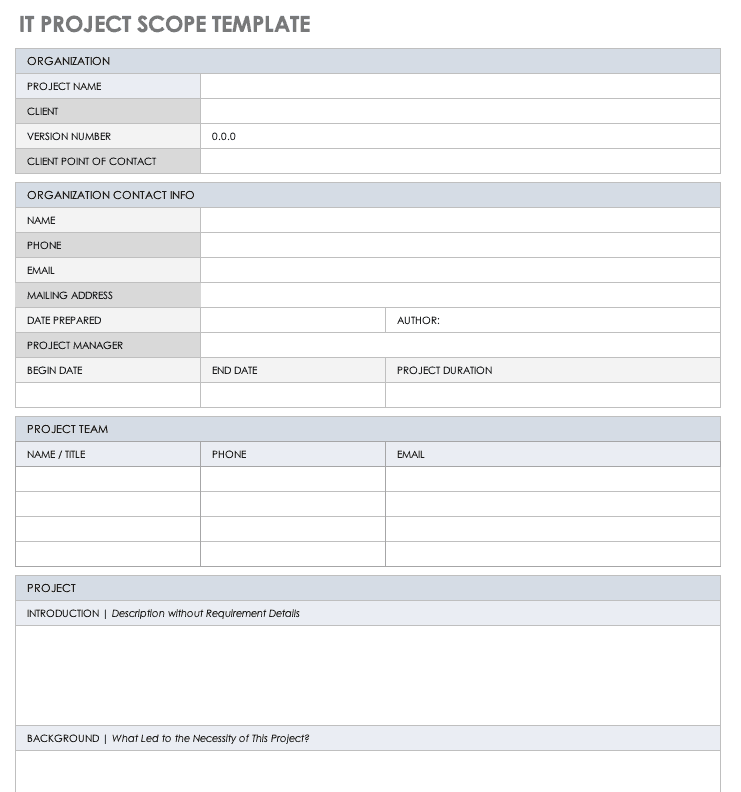 Create an IT project scope that includes background information, resource requirements, a timeline, risks, and more. You can also include details on project team members, itemized expenses, and criteria for completion. This Excel template will help you to keep your IT project on track and plan for a successful outcome.