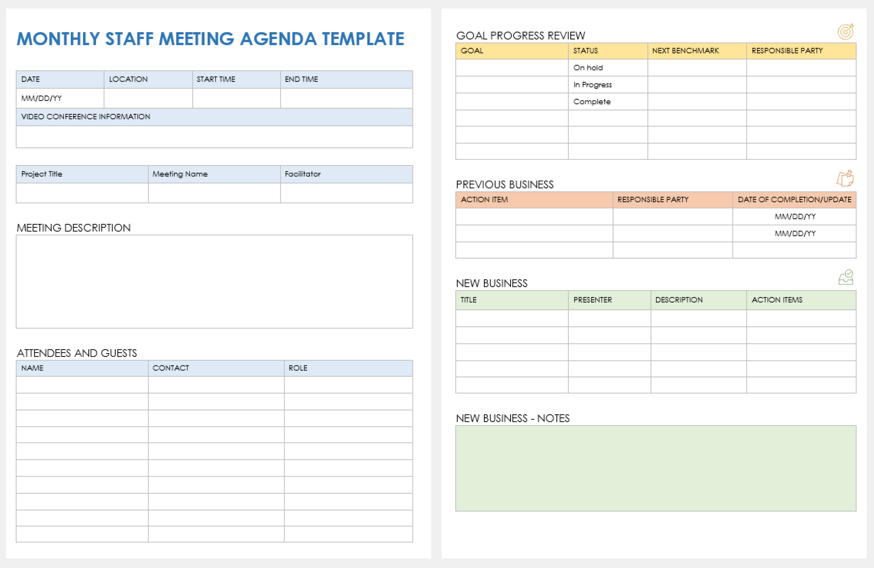 Monthly staff meetings typically have some predictable agenda items as well as non-regular, time-consuming items. Use this clear, simple template to build your monthly meeting agenda — simply record names and contact information of attendees, track long-term goals and progress, review previous business, and enter new business and related notes. Distribute the agenda to attendees ahead of time to keep everyone on the same page.