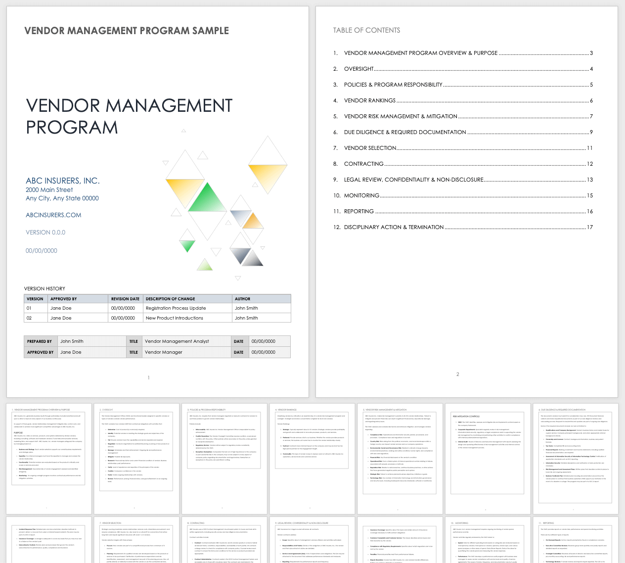 这个示例供应商管理程序来自一家保险公司。它包括常见的元素,例如概述、监督程序、政策和计划责任、供应商排名、机密性、风险管理标准等等。使用可定制模板生成新文档或改进当前的供应商管理程序,并根据需要添加指向其他文档或供应商门户的链接。