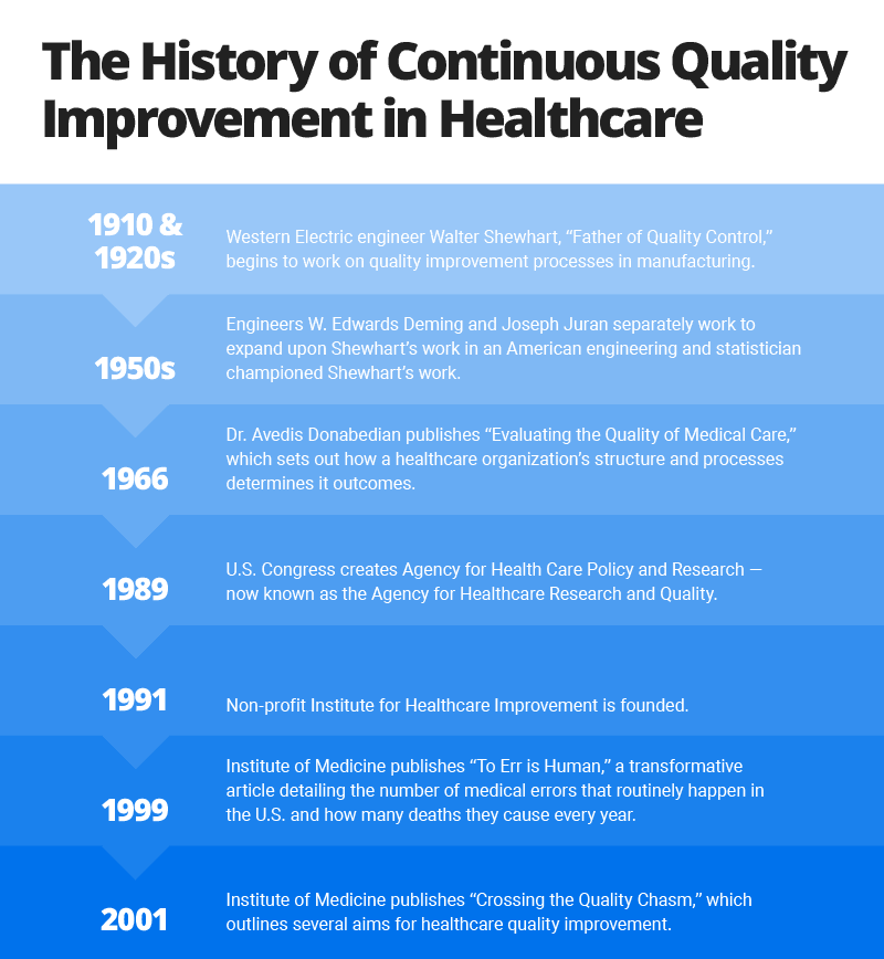 医疗保健领域的持续质量改进是始于制造业的类似流程的一个版本,可以追溯到20世纪20年代。20世纪60年代,一些医疗保健领导者和学者开始更多地考虑提高医疗保健质量。