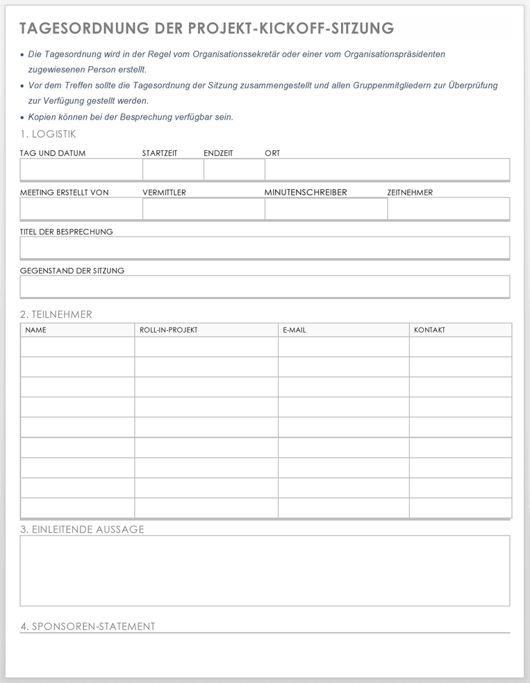 Diese Vorlage für ein Projekt-Kickoff-Meeting enthält eine Liste der Aufgaben, die Sie während des Meetings erledigen müssen. Verwenden Sie die Vorlage als Beispielgliederung, um Ihre eigene Kickoff-Checkliste zu erstellen. Fügen Sie wichtige Themen, Fragen und Aufgaben hinzu, z. B. das Zuweisen von Meetingrollen und das Definieren von Grundregeln. Einige Projektmanager fügen auch Checklistenelemente für den Aufbau der Teammoral hinzu, um die Begeisterung für das bevorstehende Projekt zu fördern.