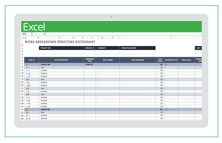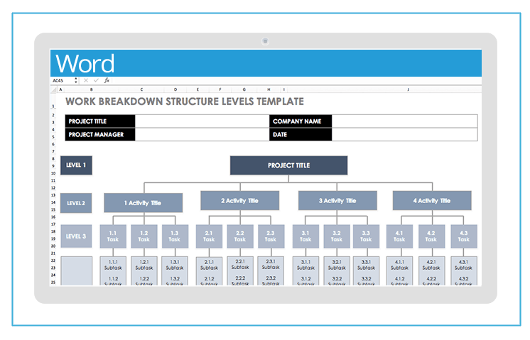 Sobald die Leistungen oder Meilensteine identifiziert sind, kann das Team die Abfolge der Aktivitäten auflisten, die zur Fertigstellung der einzelnen Leistungen erforderlich sind, und so das Projekt in praktikable Schritte gliedern. Die Hierarchie der einzelnen Schritte unterteilt das Projekt in Stufen: Die unterste Stufe ist das Arbeitspaket, das die Aktivitäten oder Aufgaben umfasst, die für die Erstellung einer Leistung oder den Abschluss eines Meilensteins erforderlich sind. Die vorformatierte Struktur einer Vorlage kann dazu beitragen, den Gliederungsvorgang zu rationalisieren und sicherzustellen, dass alle notwendigen Informationen enthalten sind.