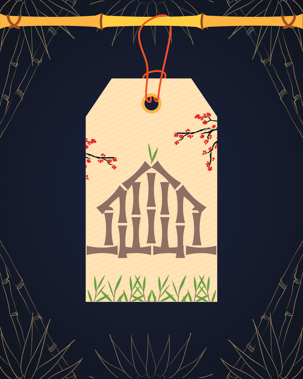 礼物标签参考了日本的礼物文化,小屋参考了竹子寺庙,樱花参考了美丽的樱花树。
