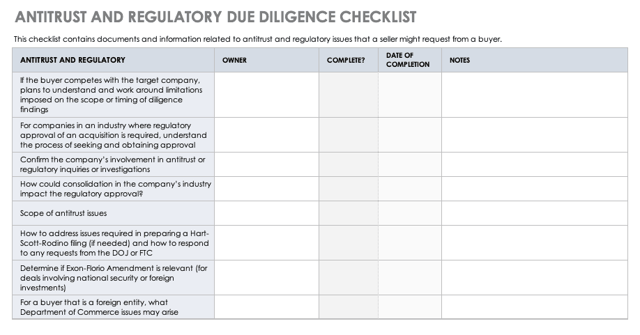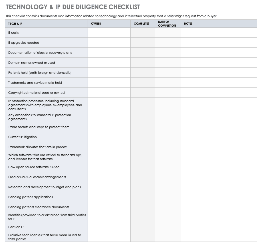 It’s a good idea to use a due diligence checklist to keep track of in-progress and completed items. That way, you can document and manage every detail as you move through the process.