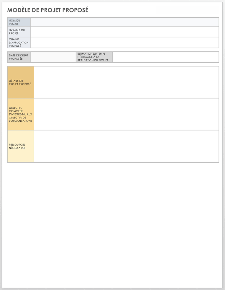 Utilisez ce modèle pour proposer un projet et fournir des détails sur le projet proposé, y compris la méthodologie. Ce modèle comprend des entrées pour donner des détails sur le projet proposé, indiquer dans quelle mesure la proposition correspond aux objectifs de l’organisation et proposer une date de début. Vous pouvez le personnaliser en fonction de vos besoins.