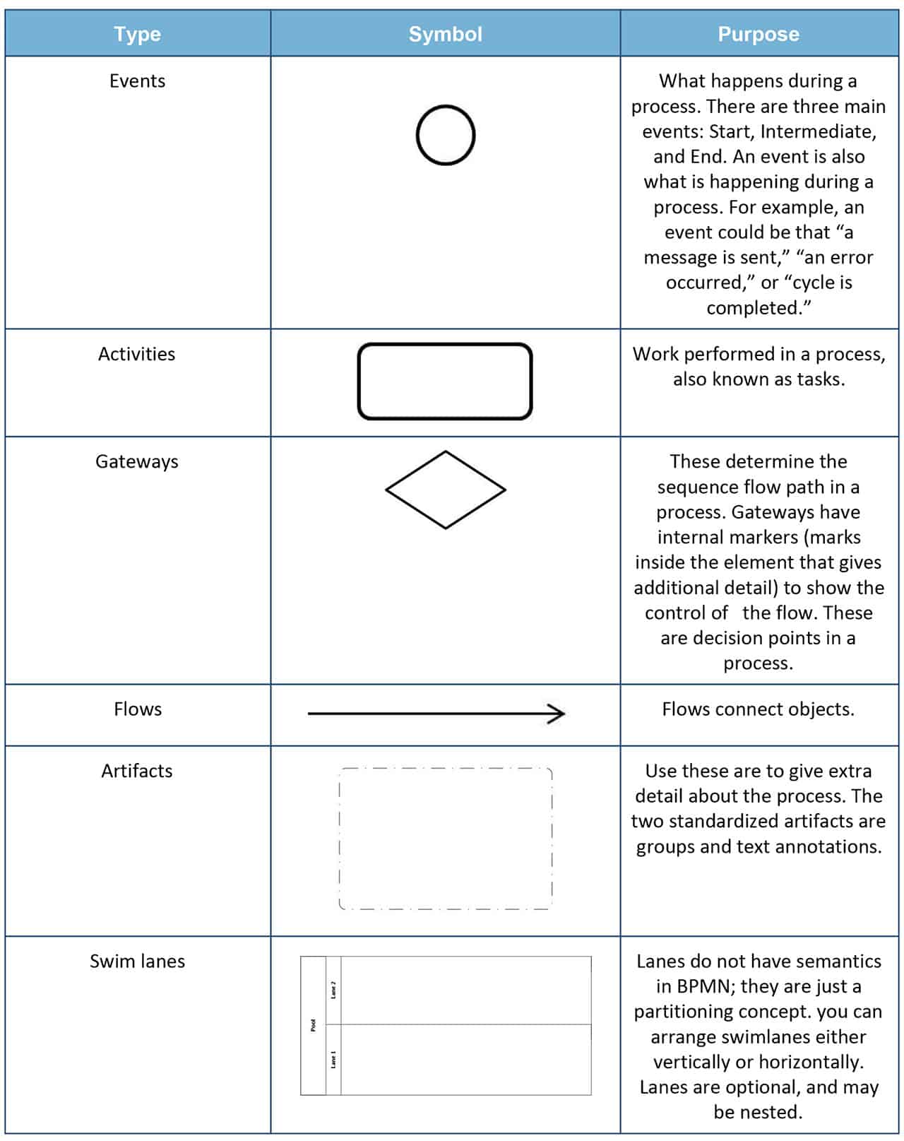 Cependant, la modélisation et la notation des processus d’entreprise (BPMN) est un sujet différent. La BPMN est une approche beaucoup plus formalisée de la cartographie et de la modélisation. Un logiciel spécial est nécessaire, et l’utilisation de la BPMN présente une courbe d’apprentissage. C’est un langage de notation extrêmement réglementé, avec des symboles spécifiés pour presque tous les scénarios. Ce sont principalement les professionnels produisant beaucoup de modèles de processus qui utilisent la BPMN. Dans tous les secteurs, les pays et les langues, la BPMN constitue un moyen cohérent d’identifier les étapes des processus. Une exploration plus approfondie de la BPMN se trouve dans leGuide du débutant en modélisation et notation des processus d’entreprise (BPMN). Certains symboles de base de la BPMN sont inclus dans le tableau ci-dessous.