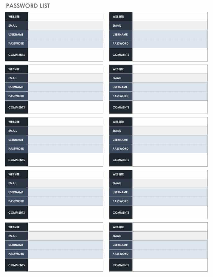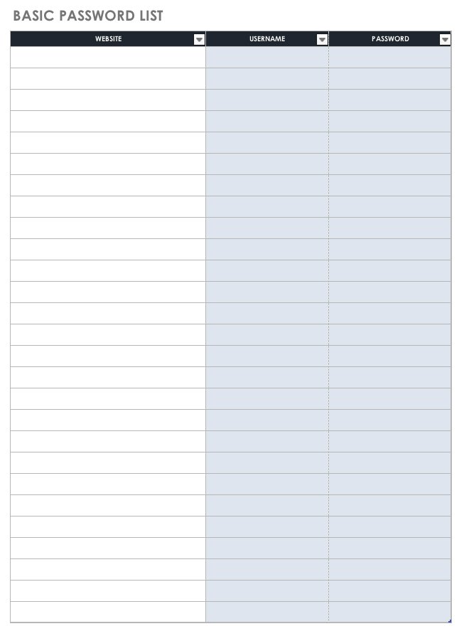 A password spreadsheet template can help you organize and track login information for email, social media, banking, shopping sites, and more. Create a comprehensive Excel spreadsheet for all the details you don’t want to forget, including notes about each account. You can organize accounts by category, create an alphabetized list, or simply add new entries as they arise.