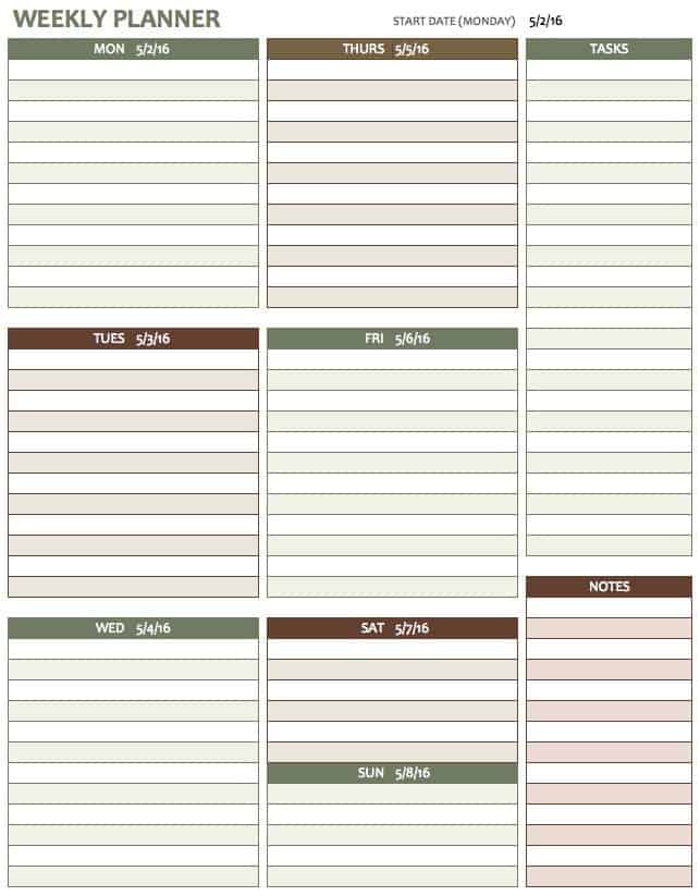 这个每周计划模板可以让你很容易地一目了然地看到你的一周,并为笔记和优先任务留出了空间。这是一个简单的选择,如果你正在寻找一个免费的,可打印的计划。记录生日和事件,创建一个待办事项清单,并计划一周中的每一天。
