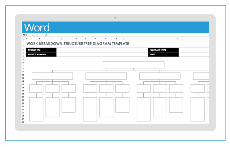 该工作分解结构图模板以易于阅读的布局按框和行排列。级别被清楚地分开,任务被分层组织。图形化的布局可以让你一目了然地了解项目概况,而结构则清晰地列出了任务的分解。这个图表视图的优点是,您可以看到工作的整体范围,而不会迷失在细节中。将它与WBS字典结合起来,就可以获得可视化结构和详细的项目信息。