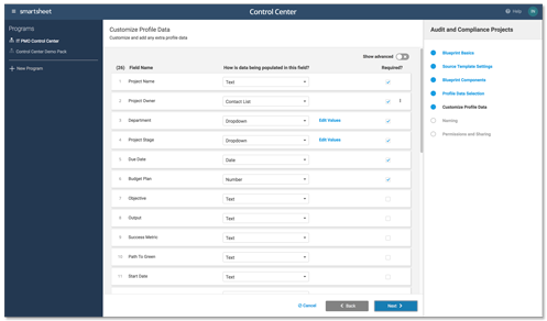 Smartsheet Control Center中的元数据是项目的配置文件信息。在Smartsheet中,您将在每个项目计划的摘要部分中看到元数据。元数据简化了项目导入工作流,并允许您跟踪和汇总来自已配置项目和报告的数据。