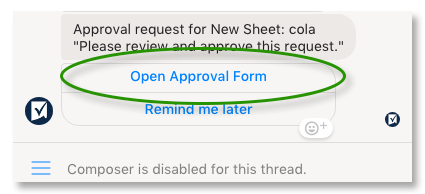 您可以通过Workplace chat中的Smartsheet聊天窗口直接审批预算请求或填写和提交更新请求。单击“打开审批表单”或“打开更新表单”以批准或拒绝审批请求,或直接从Workplace Chat完成更新请求。