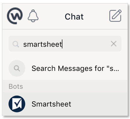 在Workplace管理员安装了与上述步骤的集成之后,您可以在Workplace Chat中通过键入“Smartsheet”将Smartsheet定位为机器人搜索聊天搜索栏。