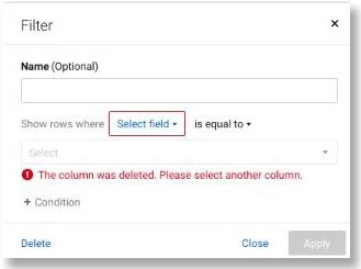 对于您创建的过滤器,如果过滤器配置不再有效,您可能会看到过滤器名称变灰,并显示一个错误图标。发生这种情况的原因有很多,比如列不再是视图配置的一部分,列类型发生了更改,或者过滤条件不再适用于该列类型。有关过滤器失效原因的详细信息,请单击Edit图标打开过滤器并查看错误的确切原因。您可以选择重新配置筛选器或删除筛选器。