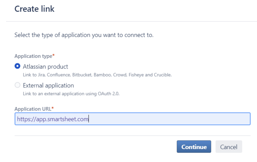 - Geben Sie die URL der zu verbindenden Anwendung ein (https://app.smartsheet.com) und klicken Sie dann entweder aufWeiteroder aufNeuen Link erstellen, je nach Jira-Version.