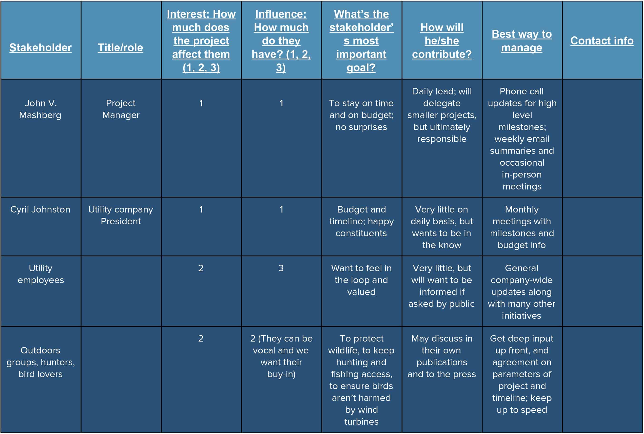 在这个场景中,我们正在为一个区域电力公司的水力发电风力发电场的建筑项目创建一个利益相关者管理计划。