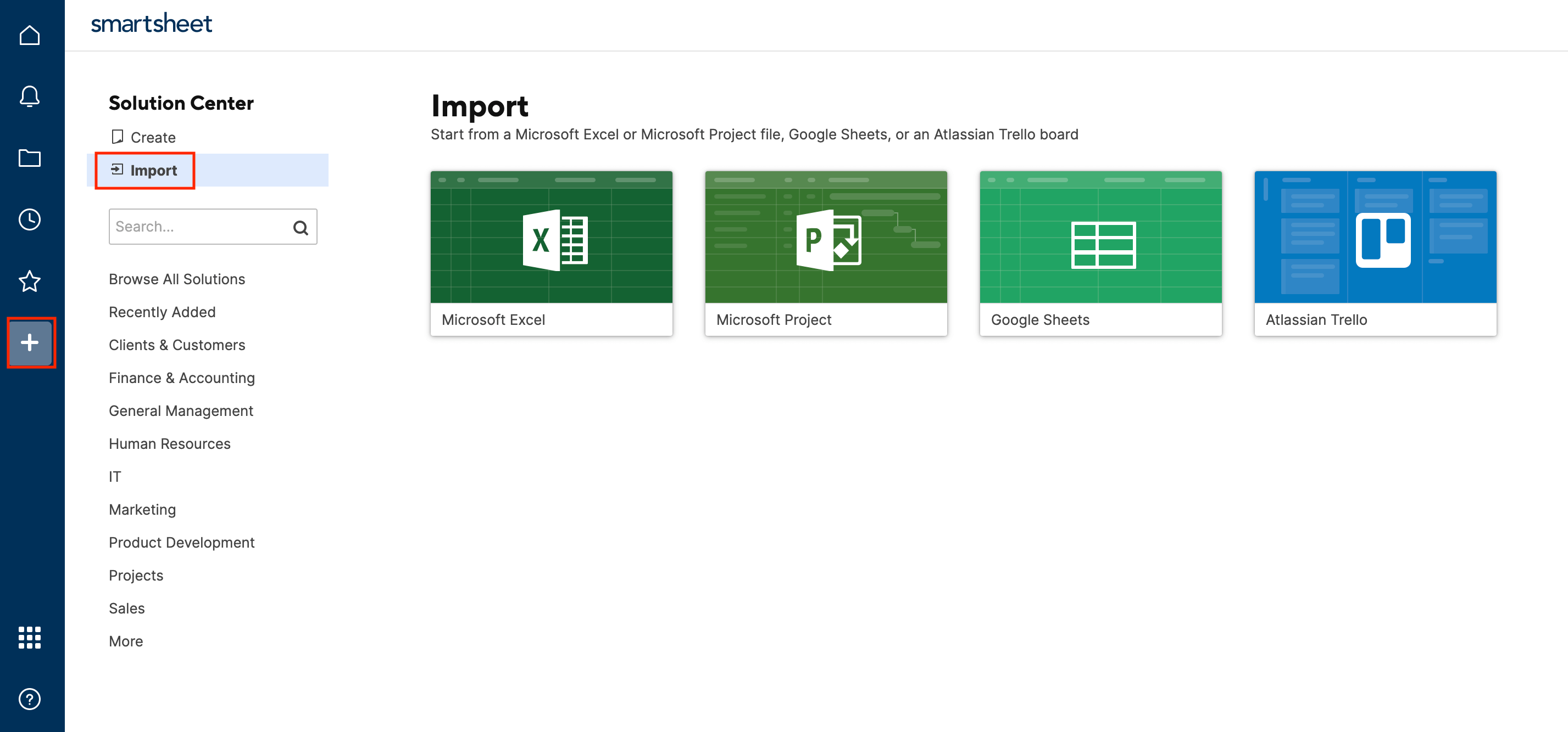 - From theHomescreen in Smartsheet, click the + icon. Then, select Import under theSolution Centersection.