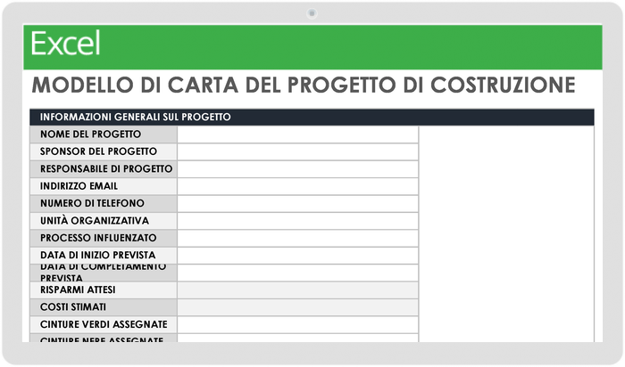 Usa questo modello di carta del progetto a pagina singola per fornire agli sponsor e ai clienti una panoramica completa dei progetti. Inserisci informazioni generali sul progetto, incluso il problema da risolvere, i traguardi, gli obiettivi e i deliverable; definisci l'ambito del progetto, la programmazione, le risorse e i costi; e descrivi i vantaggi attesi del progetto. Nella sezioneRischi del progetto,Vincoli, ePrevisioni, definisci le presupposizioni precedenti al progetto, i rischi potenziali e i vincoli di cui devi tenere conto per completare con successo il progetto.