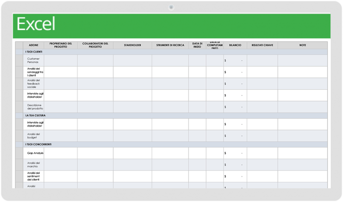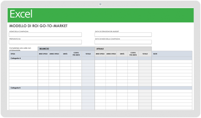 Usa questo modello GTM per il ritorno sugli investimenti (ROI), per tenere sotto controllo il budget del tuo piano commerciale e fare proiezioni sul ROI iniziale della tua campagna di marketing. Per ogni categoria GTM, inserisci quanto segue: il nome della spesa sostenuta dalla campagna; il mese in cui è stata sostenuta; il numero di unità e il costo associato alla spesa; i ricavi corrispondenti previsti; e i dati del profitto e dell’hurdle rate. Quindi, le formule preimpostate calcoleranno automaticamente i totali, inclusi i budget previsti e le spese effettive, le variazioni di spesa, il ROI e l'importo massimo che si può destinare alla spesa pur raggiungendo l'obiettivo del ROI.