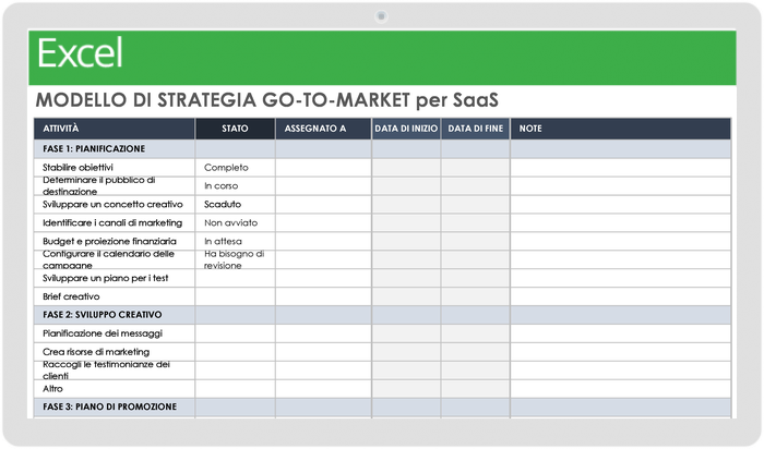 Questo modello di strategia GTM per le aziende di software-as-a-service (SaaS) identifica chiaramente gli obiettivi del piano di marketing SaaS e ti consente di gestire ogni fase del processo della tua campagna.