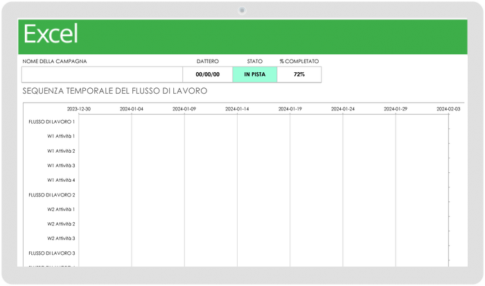 Questo modello fornisce una visualizzazione della cronologia su un intervallo di tempo di un anno. Inserisci indicatori per obiettivi trimestrali e tappe significative, come il lancio di prodotti. Usa il modello per mappare l'infrastruttura, la sicurezza o altri progetti IT.