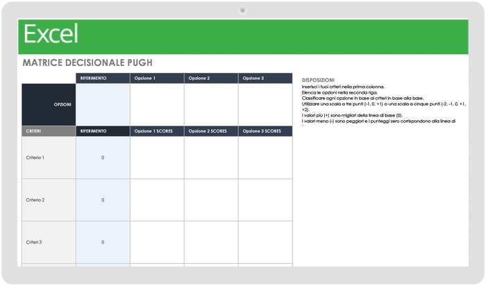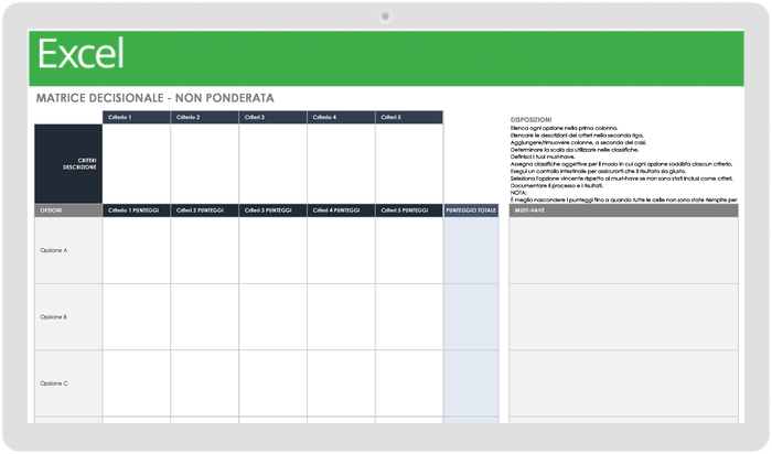 Una matrice decisionale non ponderata è particolarmente utile quando tutti i criteri hanno lo stesso peso. Utilizzate lo spazio fornito in questo modello Excel per elencare le opzioni che desiderate valutare. Quindi elencare le singole categorie e assegnare un punteggio a ciascuna di esse nella cella corrispondente. È possibile nascondere la colonna dei punteggi in modo da non usare pregiudizi quando si prende una decisione.