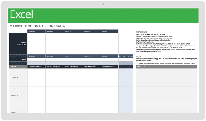 - Pesi:Anche se non è obbligatoria, la ponderazione aiuta a prendere una decisione migliore perché garantisce che i criteri più importanti abbiano un impatto maggiore sulla decisione finale.