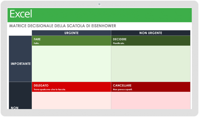 Prende il nome dal 34° presidente degli Stati Uniti, Dwight D. Eisenhower, questo metodo fornisce un quadro di riferimento per decidere quali azioni affrontare per prime. In questo modello di Microsoft Word, le etichette Urgente e Non urgente si trovano in alto e le etichette Importante e Non importante in basso a sinistra. Questo layout divide il riquadro in quattro segmenti, intitolati Fare e Decidere nella riga superiore e Delegare e Cancellare in quella inferiore. È sufficiente elencare i compiti della lista nella sezione che ha più senso.