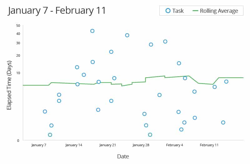 - 控制图:控制图只是一个跟踪器,它记录了何时执行任务(或问题),每项任务需要多长时间,以及处理时间的平均和滚动平均。所有这些数据点都存在于同一个轴上,因此很容易发现周期时间中的偏差。平均周期时间的减少是开发效率提高的一个指标。