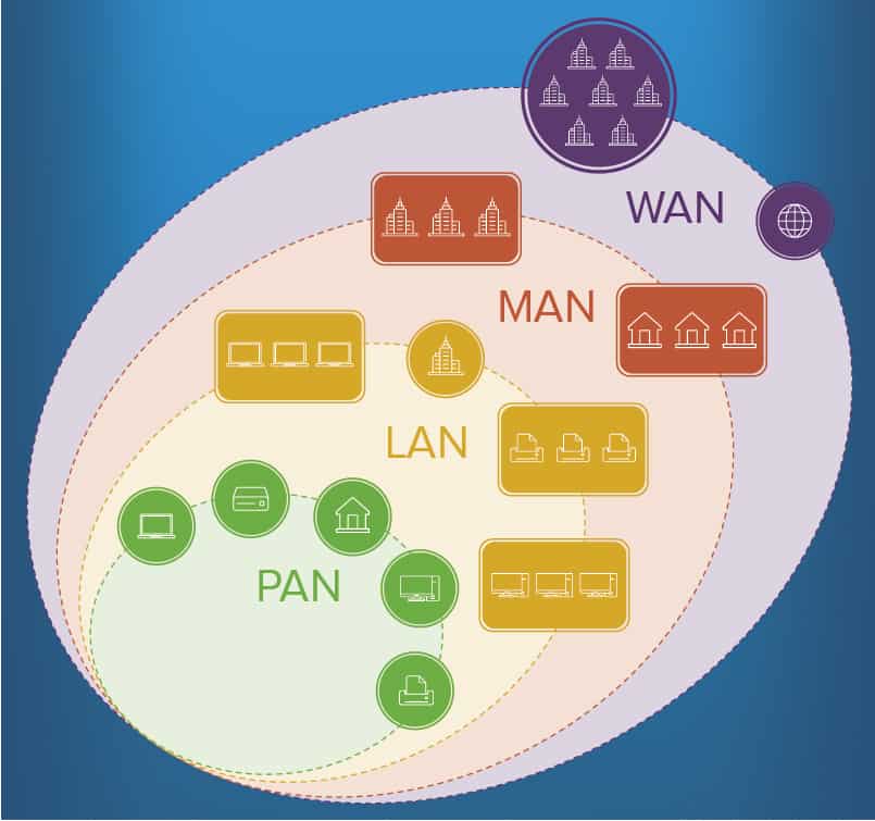 - 个人区域网络:PAN包括短范围内所有连接的设备。WPAN或无线个人网络可以描述您家中的网络,您可以在车库工作或在阳台上使用笔记本电脑工作时收听您最喜欢的互联网电台。如果一个住所内有不止一个人在使用该网络,PAN有时被称为HAN,或家庭区域网络。