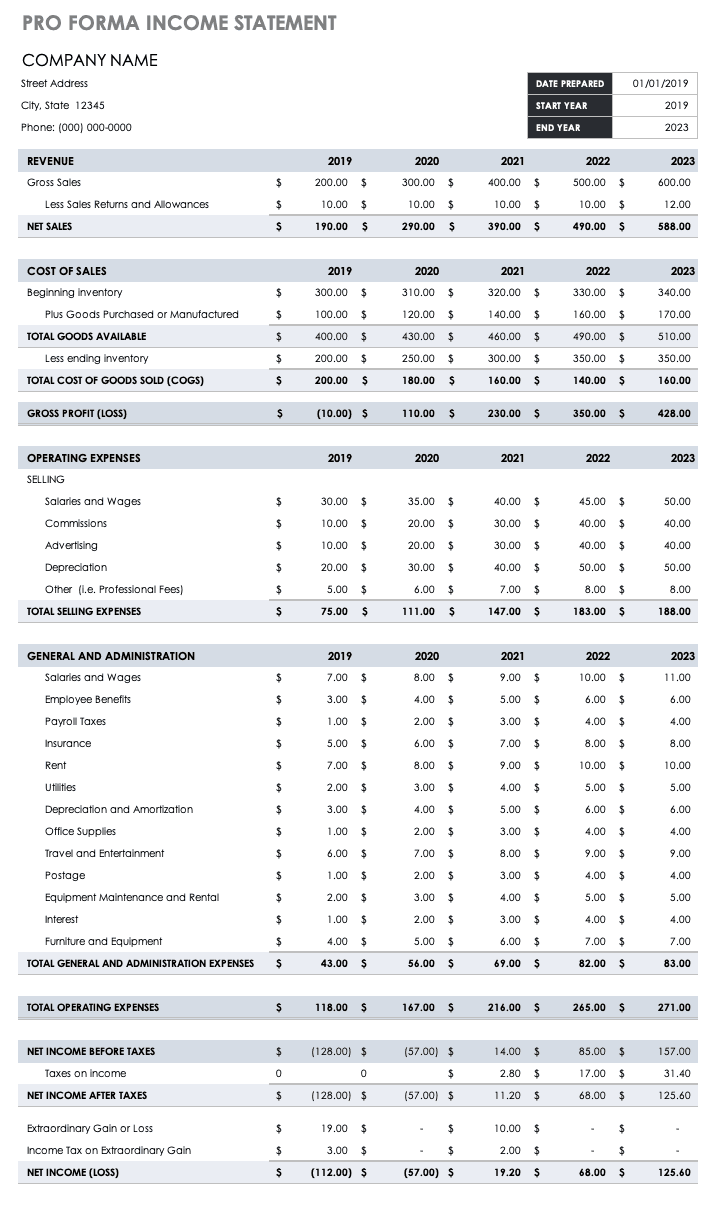 预估损益表通常预测至少三年,而常规损益表可能只是上一年或根据贷款人的要求。根据美国证券交易委员会(SEC)的规定,当上市公司被要求提供会计年度的预估损益表时,不需要提供中期损益表。但是,对于所有在文件中提交的定期损益表,还必须有预估报表。使用这个形式损益表模板来创建你自己的损益表。此表格亦可用于企业零售或批发公司。