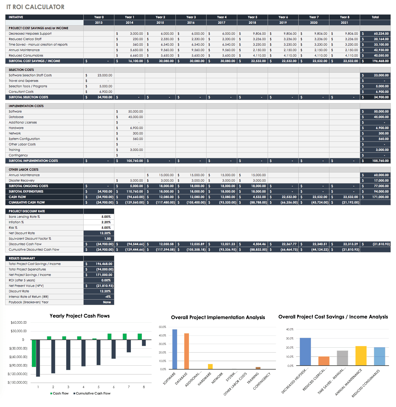 一旦您计算了所有的财务价值和项目成本,ROI公式就很简单了。让我们在下面的例子中假设我们的项目有一次性成本$400,000来减少20%的生产时间。ob欧宝娱乐app手机下载在这个例子中,第5年收支平衡,随着公司的发展,可以节省很多钱: