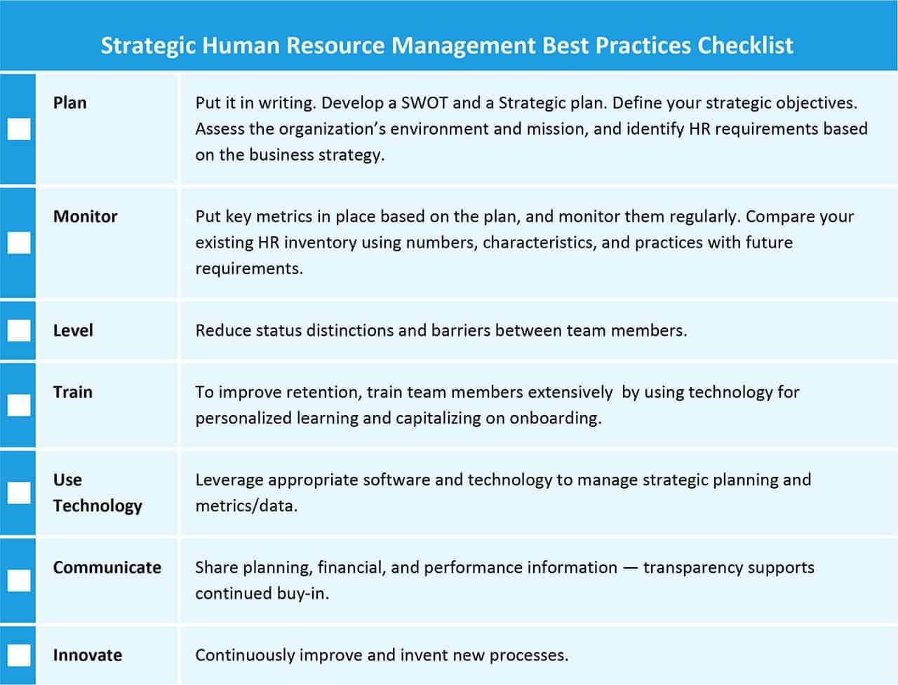 每个组织都需要创建自己详细的最佳实践,因为战略人力资源管理规划的性质决定了它应该为每个特定的组织量身定制。